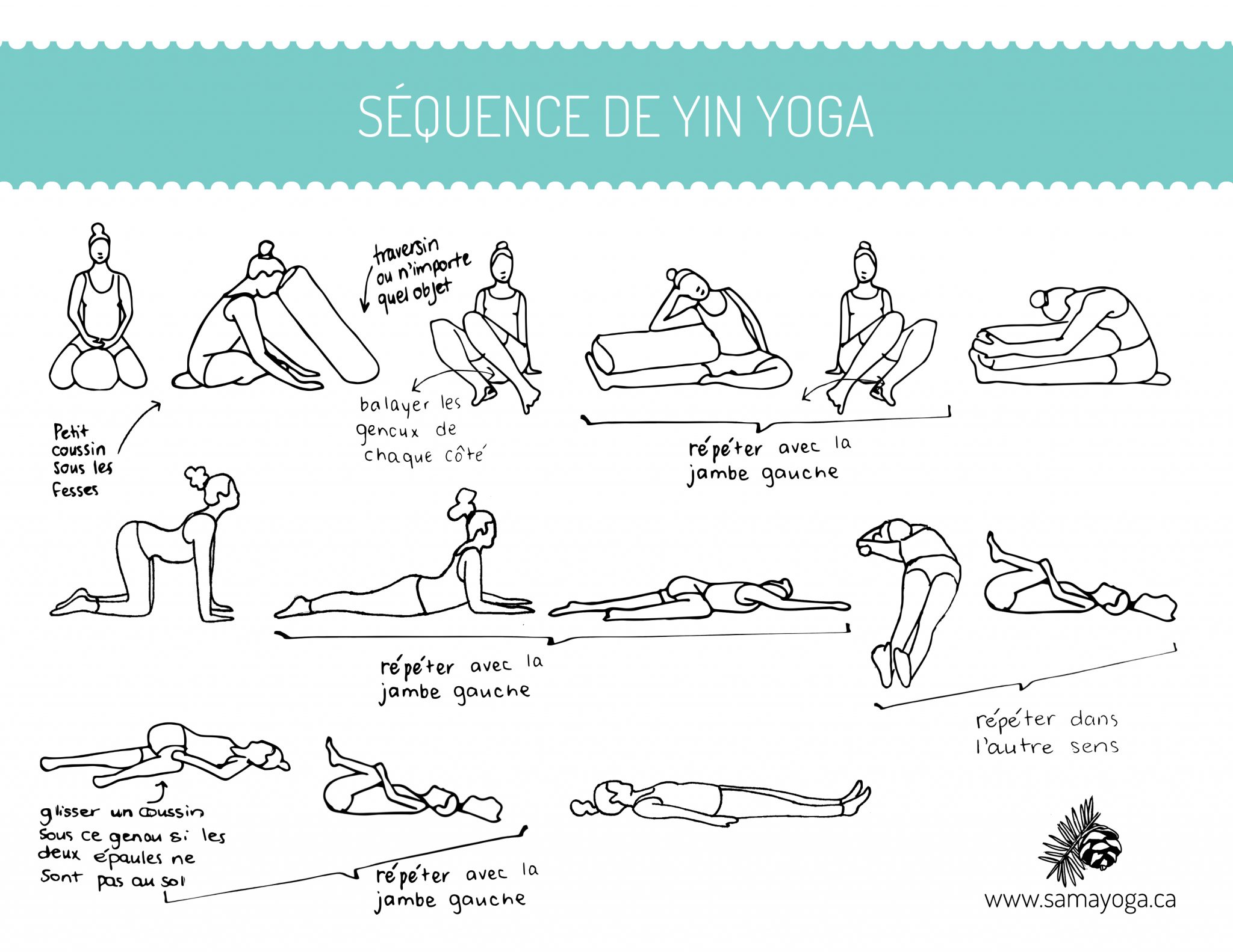J’ai construit cette séquence de mouvements à partir du livre The Complete Guide to Yin Yoga. Ici, les postures visent principalement la colonne vertébrale, mais on trouve plusieurs autres séances dans le livre en question. Je trouve ces postures simples et faciles à répéter chez soi. Si vous n’avez pas de traversin, un oreiller ou deux peuvent faire l’affaire.